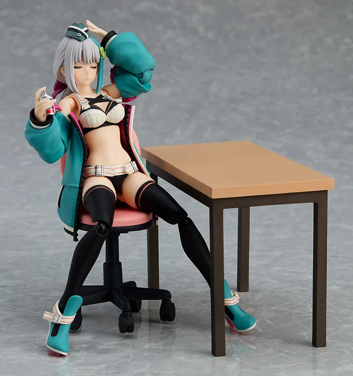 A new Plastic Angel has come down from on high to bless us! It’s the delectable Lanna! Lanna’s set comes with three face plates – a smile, a winking face, and an expressionless face. For optional parts, Lanna comes with a giant pair of nippers to hold in both hands, a regular sized pair of nippers, an air brush, a spray paint can, and even a desk and chair to work hard at! Or sleep at, after a long, hard day of model building. Further adding to Lanna’s display options is an alternate body part that presents Lanna in her trendy oversized jacket. After all, it probably gets cold in that skimpy outfit!